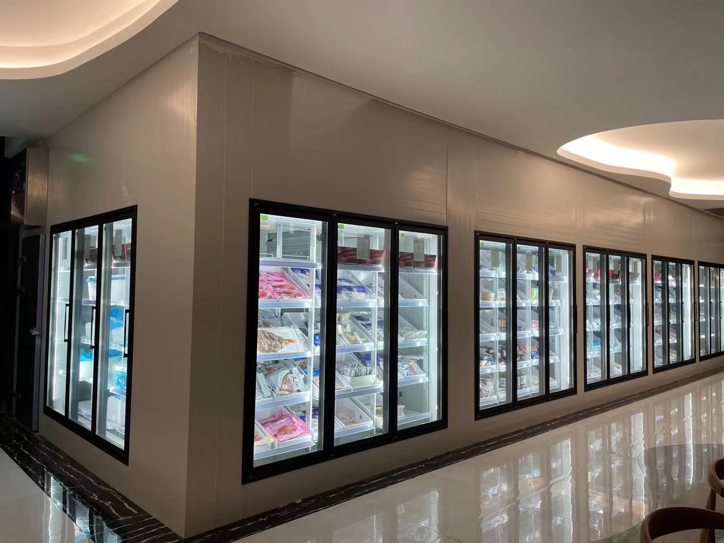 Supermarket glass door cold storage is a kind of refrigeration equipment commonly found in supermarkets and stores, usually used to display and store goods that need to be kept at low temperatures, such as beverages, dairy products, frozen foods, etc.